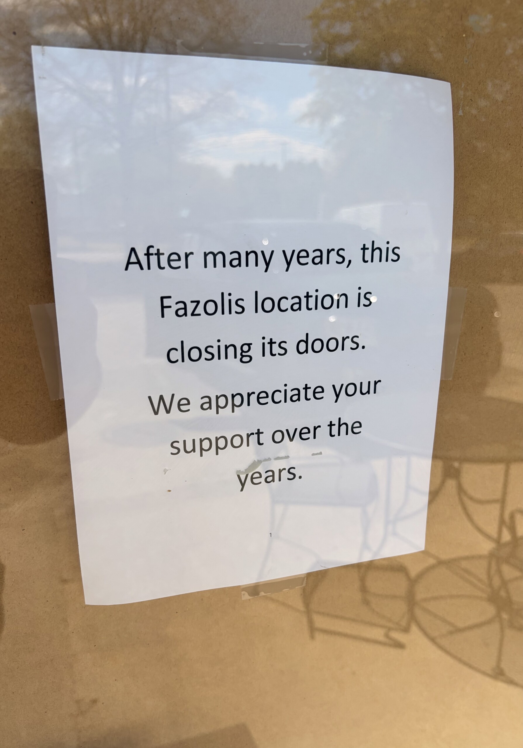 The restaurant has a sign on its door that says, “After many years, this Fazoli’s location is closing its doors. We appreciate your support over the years.”