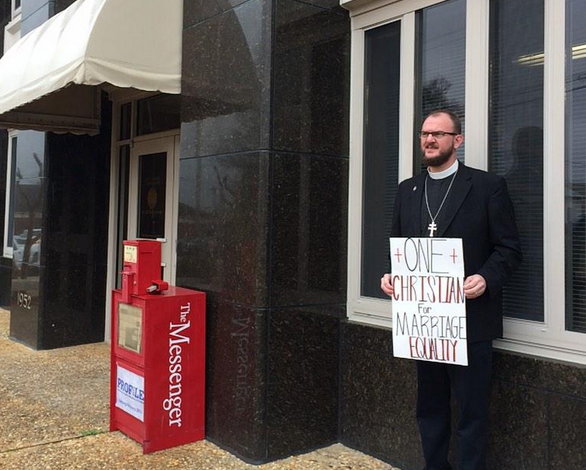 A member of the Pike County faith community takes a stand for marriage equality in front of the courthouse.
